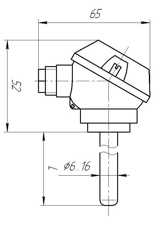Диапазон измерений -196...+600 °С. Тип защитной арматуры — кабель RTD в стальной оболочке (12Х18Н10Т). Диаметр арматуры 8 или 10мм. Материал клеммной головки — алюминиевый сплав, размер 65х52мм.