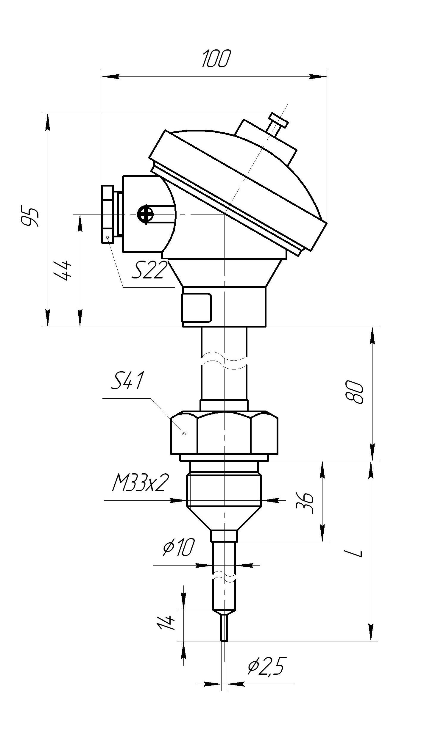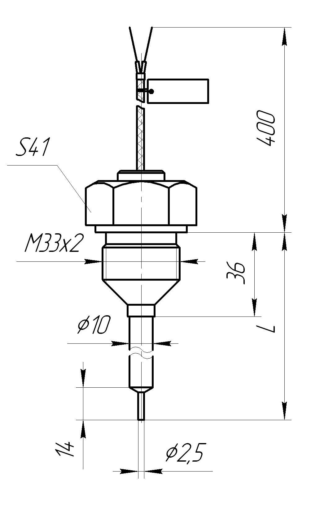 Термопара без корпуса, с кабельным выводом длиной 360 мм, защитная арматура — со штуцером М33х2, материал — сталь 12Х18Н10Т, рабочий конец Ø2,5 мм. Термоэлектроды Ø1,5 мм. Рабочий спай изолирован. Условное давление измеряемой среды Ру=4,0 МПа. |