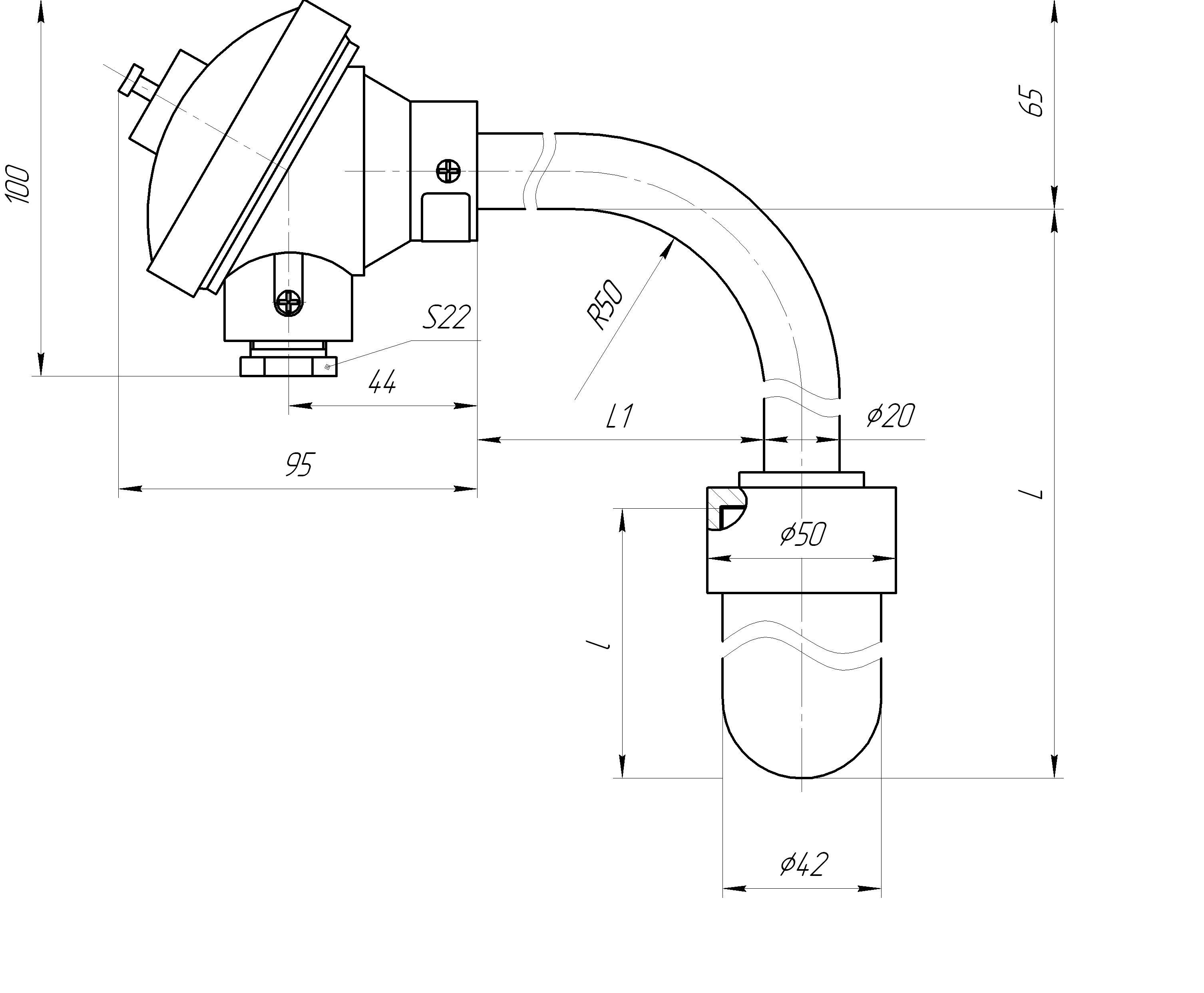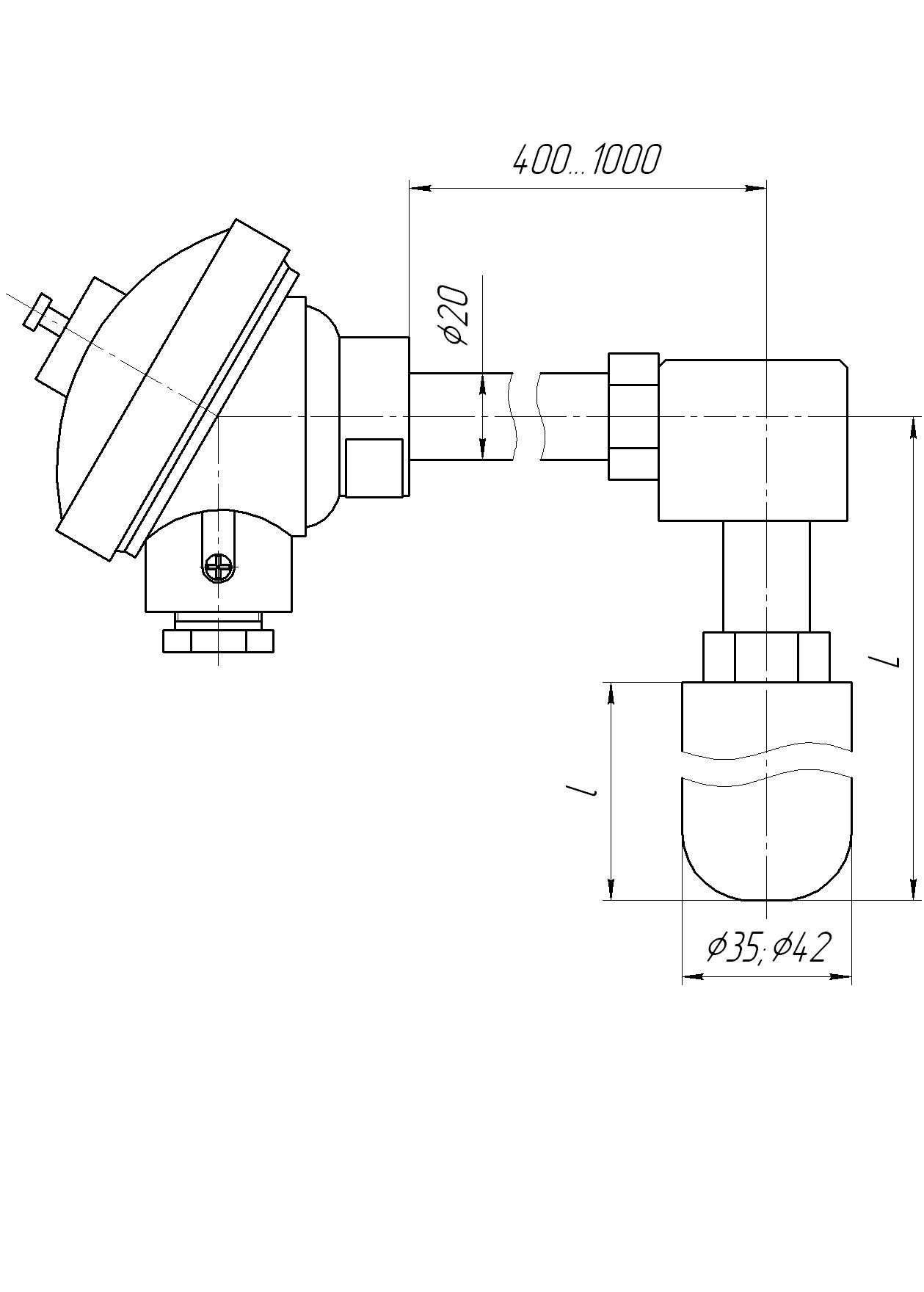 Защитная арматура — без штуцера, материал — сталь 15Х25Т или 12Х18Н10Т, Ø20 мм, погружаемая часть — чехол импортного производства из специального чугуна с неметаллическим покрытием Ø35 или 42 мм (участок длинной l), материал головки — алюминиевый сплав. Рабочий спай изолирован. Условное давление измеряемой среды Ру=10 МПа. Термоэлектроды из высокостабильного импортного термопарного кабеля 1-го класса. Арматура изогнута под углом 90°. |