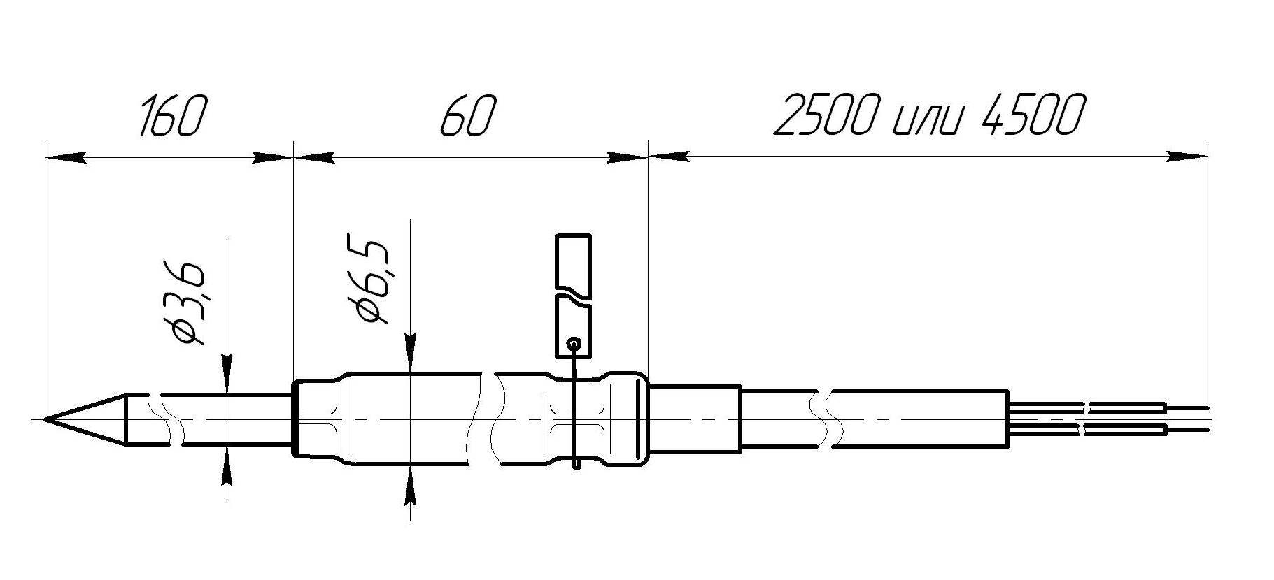 Чувствительный элемент покрыт силиконом. Датчик без корпуса, защитная арматура в виде иглы 3,6 мм, материал — сталь 12Х18Н10Т. Кабель СФКЭ сечением жил по 0,5 мм², длиной 2500 или 4500 мм. Термоэлектроды Ø0,5 мм. Условное давление измеряемой среды Ру=0,4 Па. |