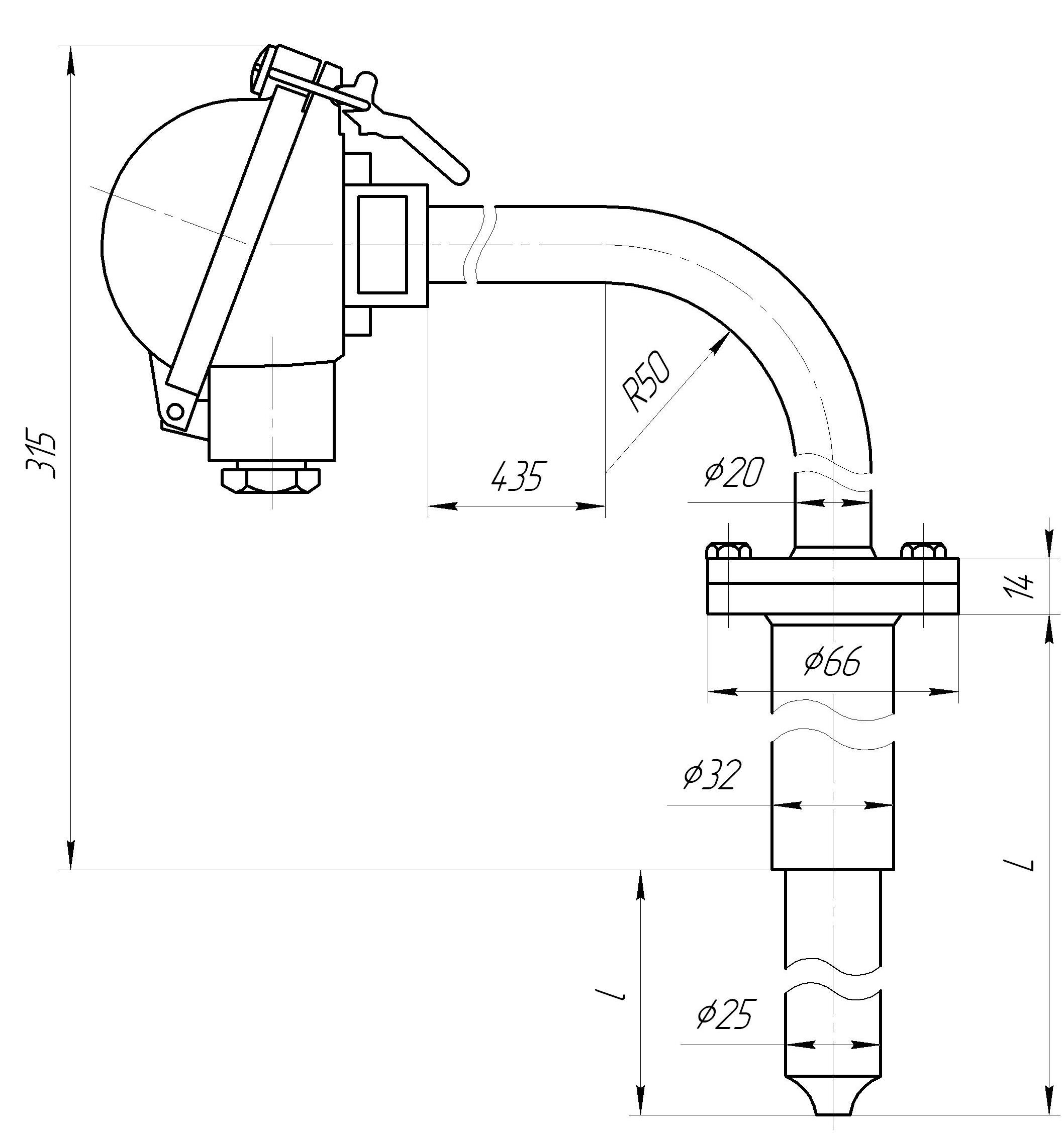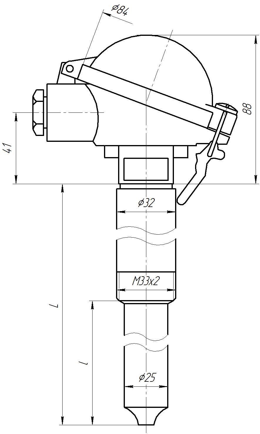 Защитная арматура — без штуцера, арматура изогнута под углом 90°, материал — сталь 15Х25Т, Ø32 мм. Погружаемая часть — карбид кремния, Ø25 мм, материал головки — алюминиевый сплав. Конструкция разборная с транспортным чехлом. Негерметичны к измеряемой среде. Термоэлектроды Ø1,2 мм. Один чувствительный элемент. |
