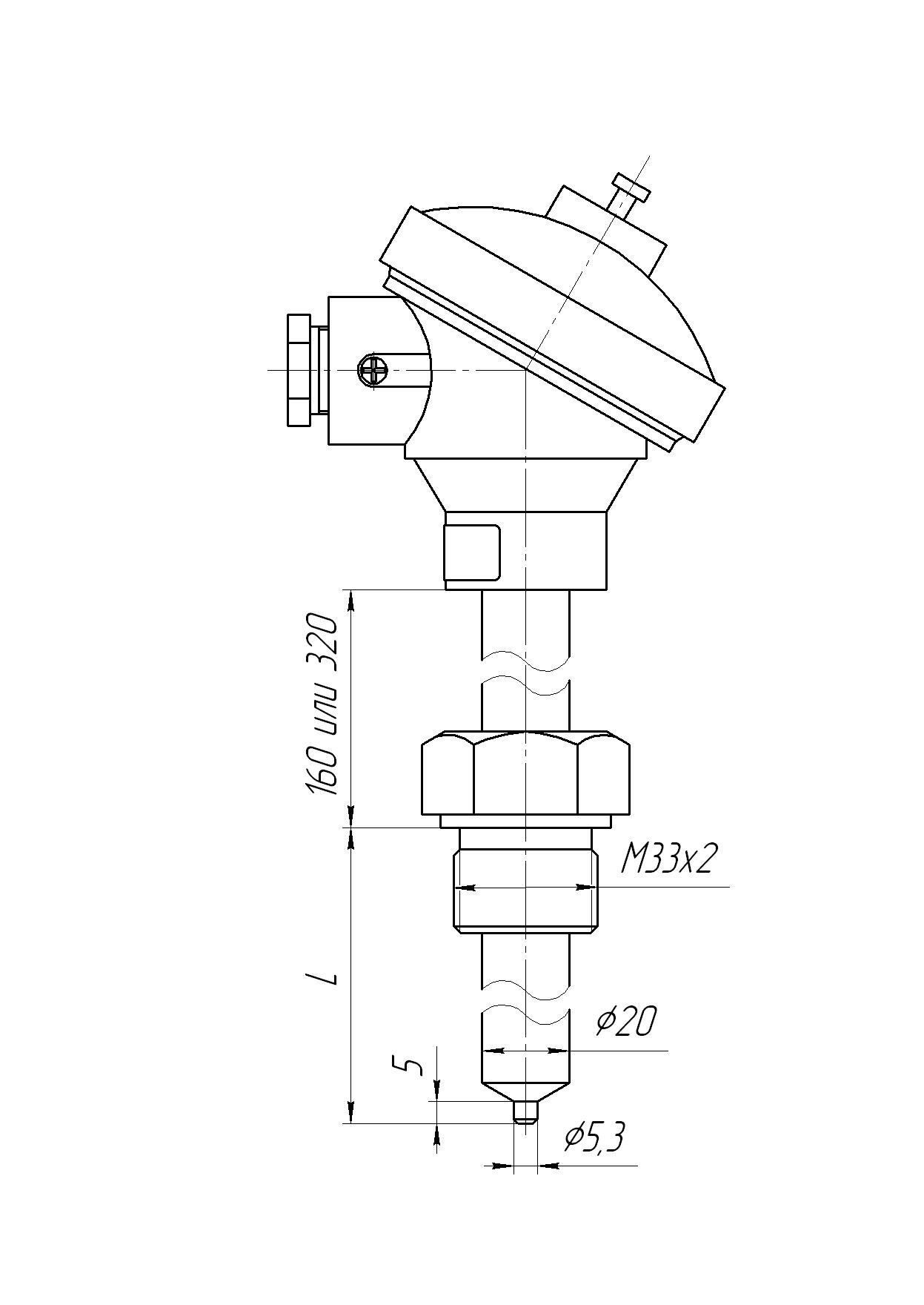 Защитная арматура — с неподвижным штуцером М33х2, расстояние от штуцера до корпуса L1=320 мм. Материал — сталь 15Х25Т Ø20 мм с утонением до 5,3 мм, материал головки — алюминиевый сплав. В качестве чувствительного элемента применен импортный термопарный кабель 1-го класса. Рабочий спай изолирован. Условное давление измеряемой среды Ру = 6,3 МПа.