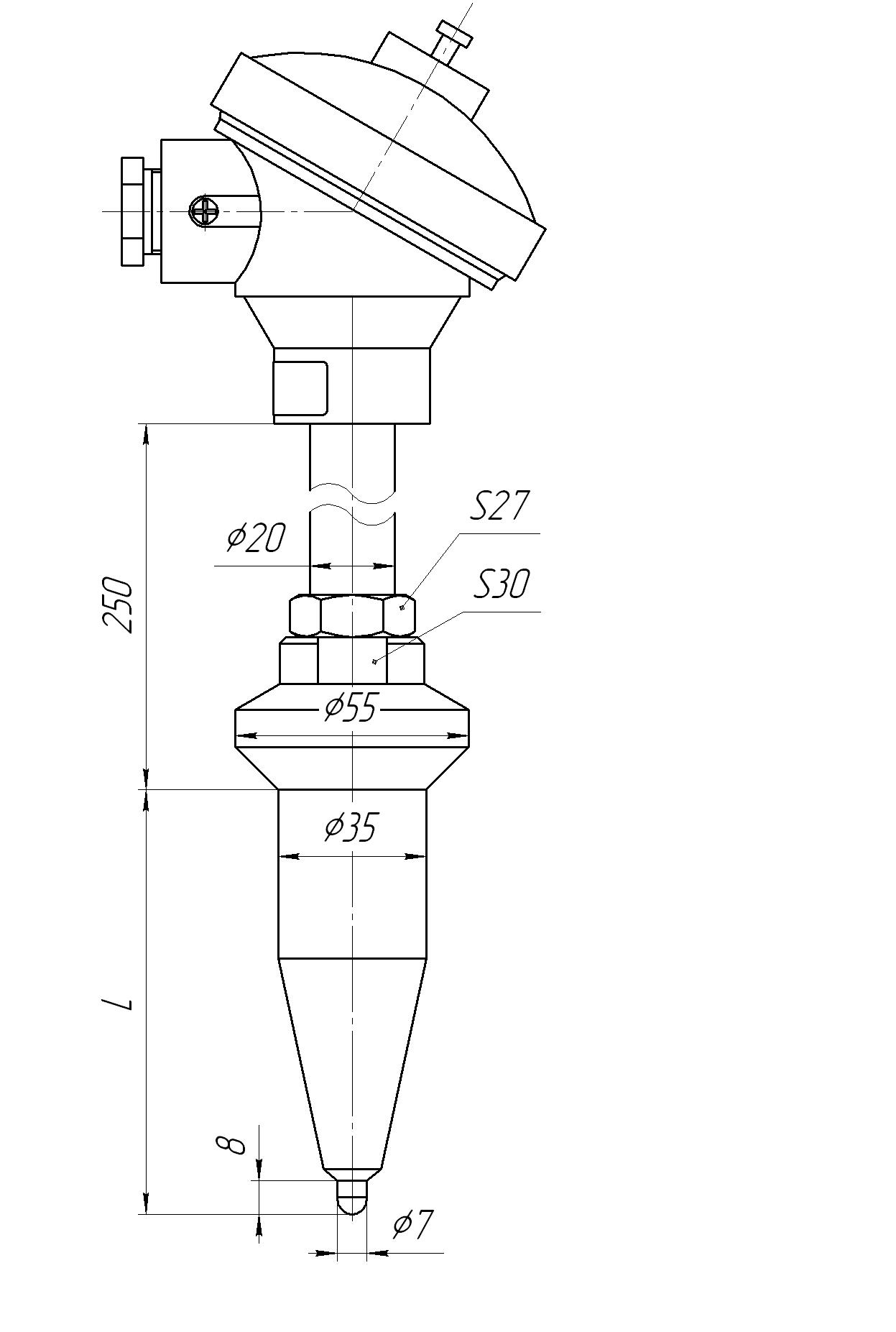 Защитная арматура — без штуцера, с конусообразным наконечником Ø35 мм, материал — сталь 12Х1МФ, без головки, труба Ø20 мм — сталь 12Х18Н10Т. Крепление к контролируемому агрегату — сваркой до 55 мм. Сменная термометрическая вставка — импортный термопарный кабель 1 класса длиной 20 или 30 метров. Рабочий спай изолирован. Условное давление измеряемой среды Ру=25,5 МПа. |