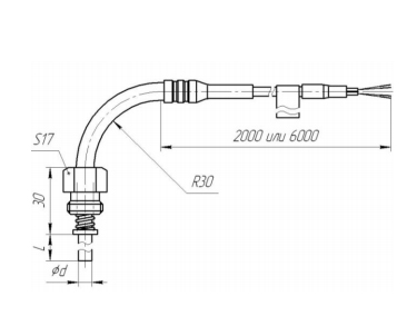 Без головки, защитная арматура - изогнутая под углом 90 градусов по R30, со штуцером М16х1,5 и пружиной для обеспечения надёжного контакта с измеряемой поверхностью, материал - сталь 12Х18Н10Т 6 мм. Соединяется с прибором компенсационным кабелем СФКЭ (ХА) сечением жил по 0,5 мм2 длиной 2000 мм или 6000 мм. Термоэлектроды ø 0,5 мм. Рабочий спай изолирован.