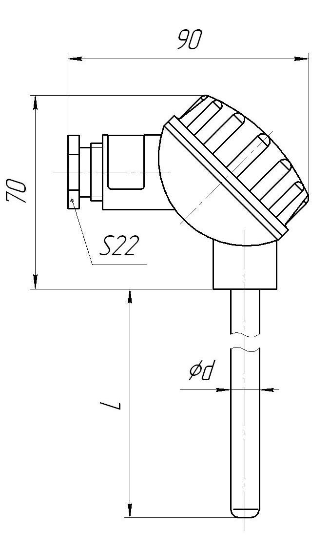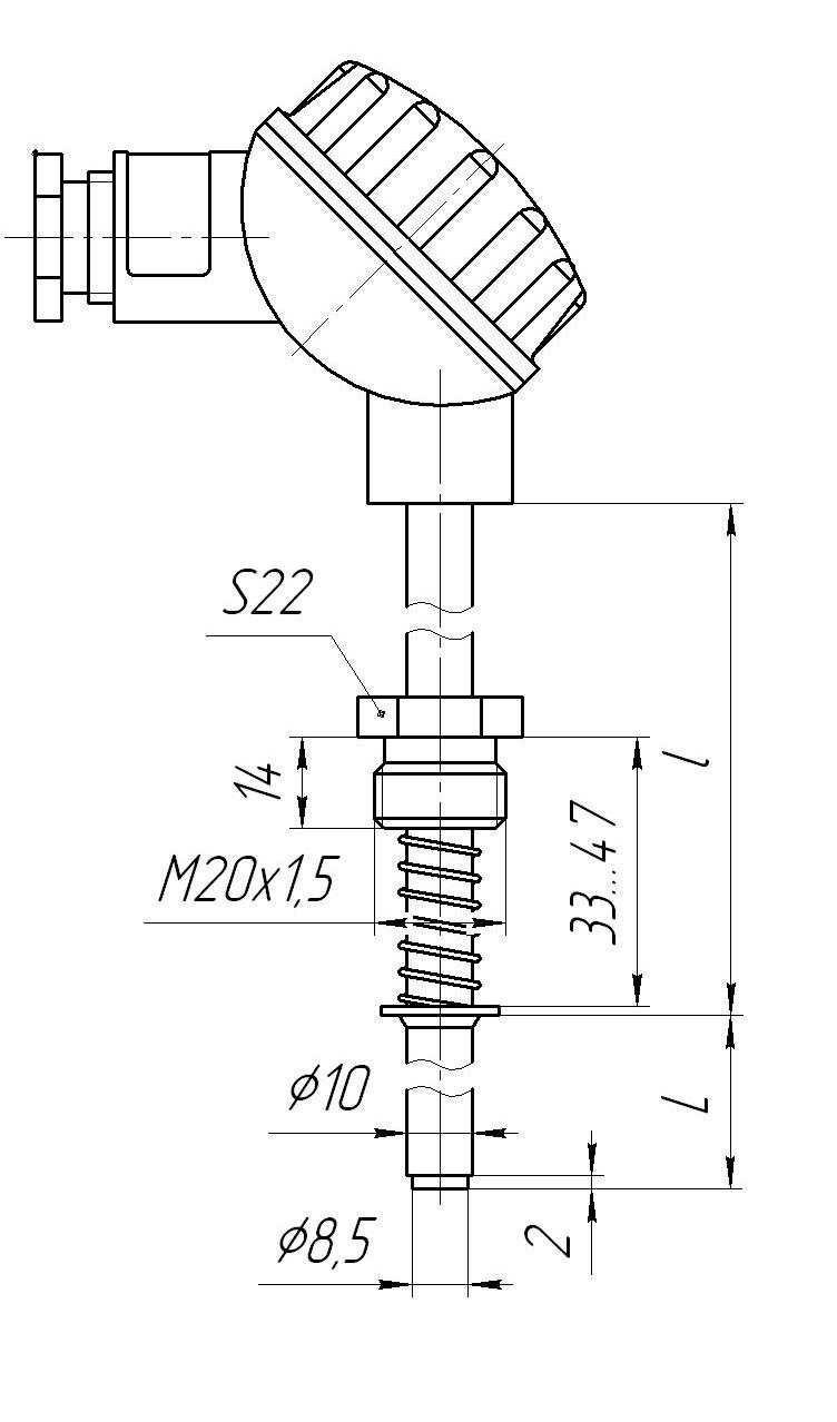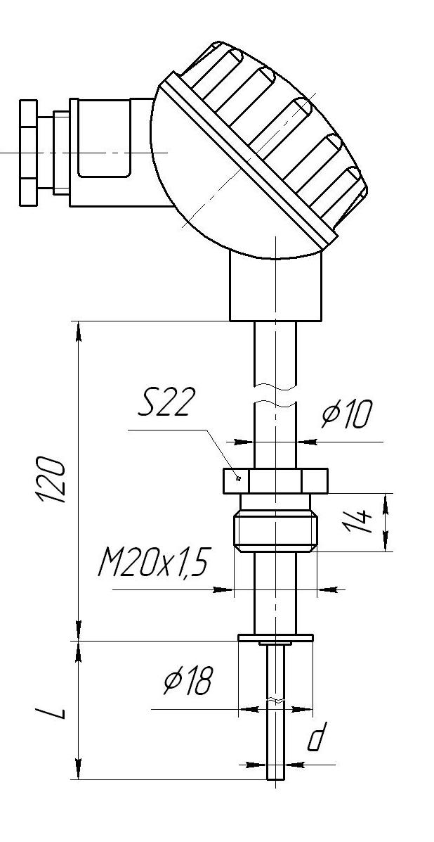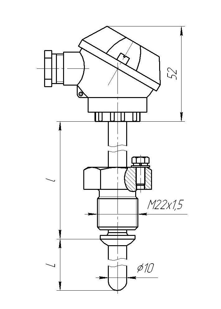 Материал головки — термостойкая пластмасса. Защитная арматура Ø10 мм, штуцер подвижный М20х1,5. Рабочий спай изолирован. Условное давление измеряемой среды Ру=6,3 МПа. Один чувствительный элемент. |