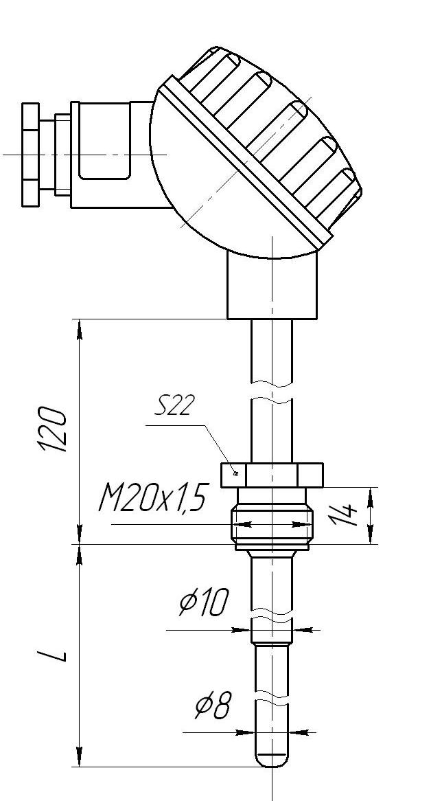Материал головки — термостойкая пластмасса. Защитная арматура Ø10 мм, штуцер подвижный М20х1,5 и утонением 8х60 мм. Рабочий спай изолирован. Условное давление измеряемой среды Ру=6,3МПа. Один чувствительный элемент. |