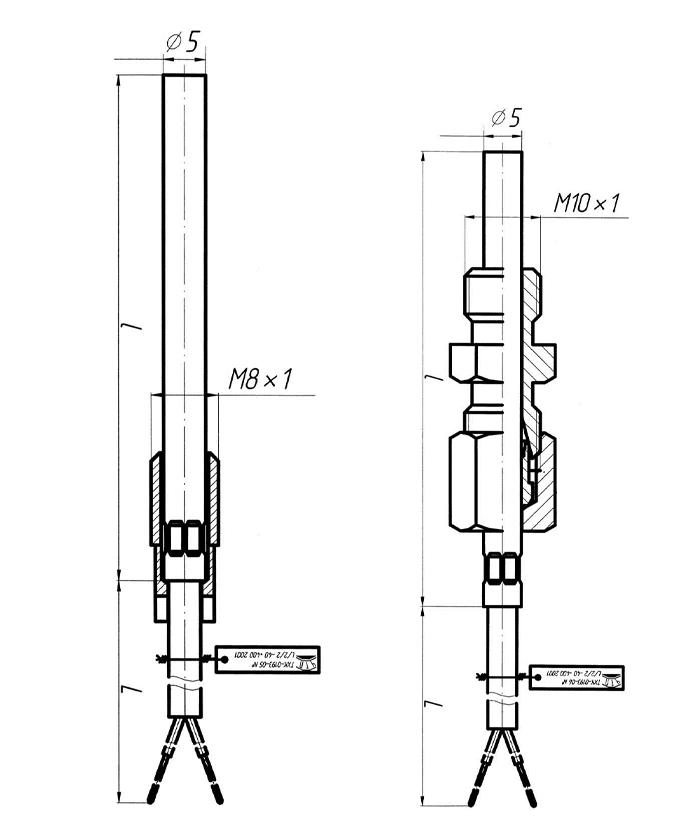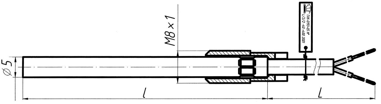 для ТХК -2 (по ГОСТ 6616) Без головки, защитная арматура - со штуцером М8х1 накидным, материал - сталь 12Х18Н10Т 5 мм. Соединяется с прибором компенсационным кабелем из провода ПТН ХК 2x0,5 с наружной оболочкой из фторопластовой трубки длиной 2000мм или 6000 мм. Термоэлектроды Ø 0,5 мм. Рабочий спай не изолирован.