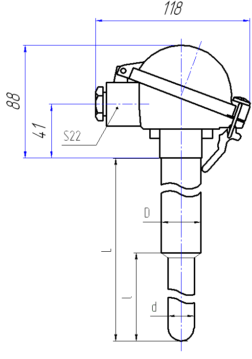 Защитная арматура — без штуцера; материал арматуры (D) — стали 12Х18Н10Т, 15Х25Т, либо ХН45Ю; D/d=30/20, 32/25, 25/15, 24/20, 16/10 либо 14/8мм; термоэлектроды Ø0,5/0,5 мм или Ø0,4/0,5 мм. |