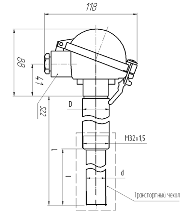 Защитная арматура - без штуцера; материал арматуры (D) — сплав ХН45Ю; материал погружаемой части (d) — газоплотный карбид кремния; D/d=32/25 мм; материал внутреннего чехла — корунд; термоэлектроды Ø0,5/0,5 мм; рабочий спай изолирован. |