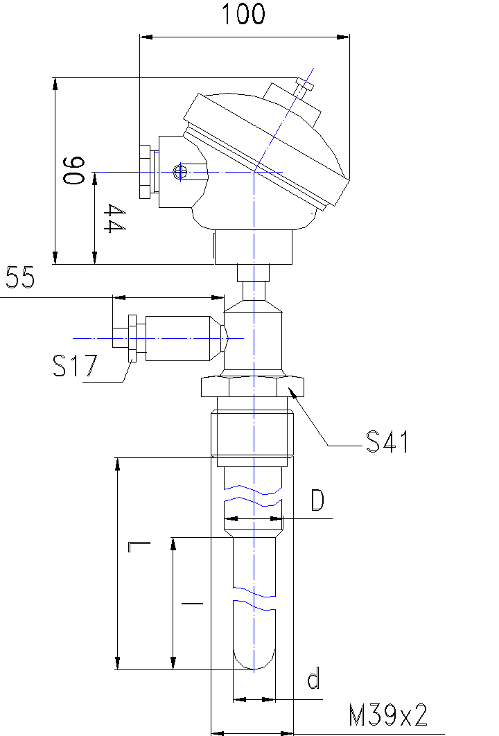 Защитная арматура — со штуцером М39х2; материал арматуры (D) — сталь 12Х18Н10Т; материал погружаемой части (d) — корундовая керамика; D/d=28/20 мм; термоэлектроды Ø0,5/0,5 мм; не герметичны к измеряемой среде. Предусмотрен газовый наддув (азотом) для исключения проникновения вредных веществ внутрь защитной арматуры. |