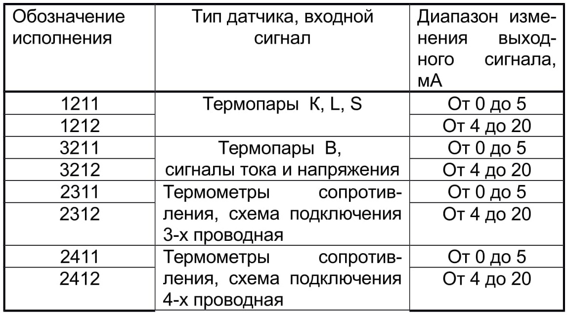 Преобразователи имеют исполнения, приведенные в таблице 1