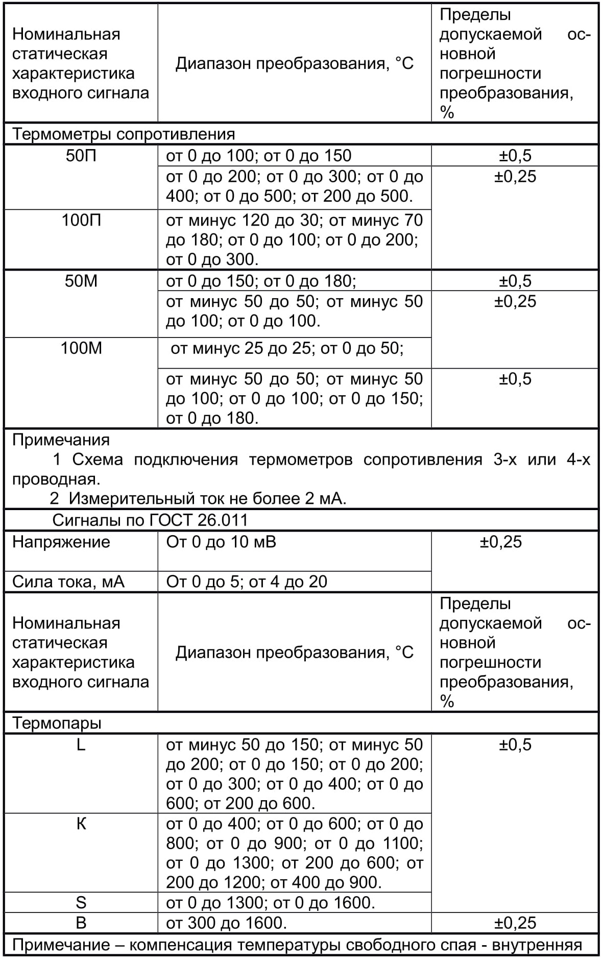 Входные сигналы, НСХ, диапазоны преобразования, пределы допустимой основной приведенной погрешности
