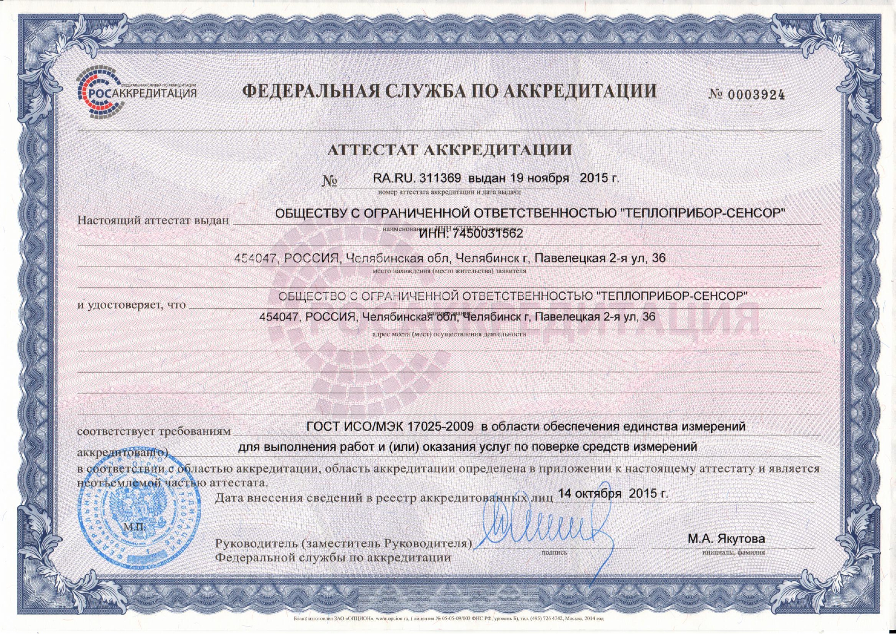 ООО «Теплоприбор-Сенсор» аккредитовано для выполнения работ и (или) оказания услуг в области обеспечения единства измерений на поверку средств измерений. Выписка из реестра аккредитованных лиц и область аккредитации