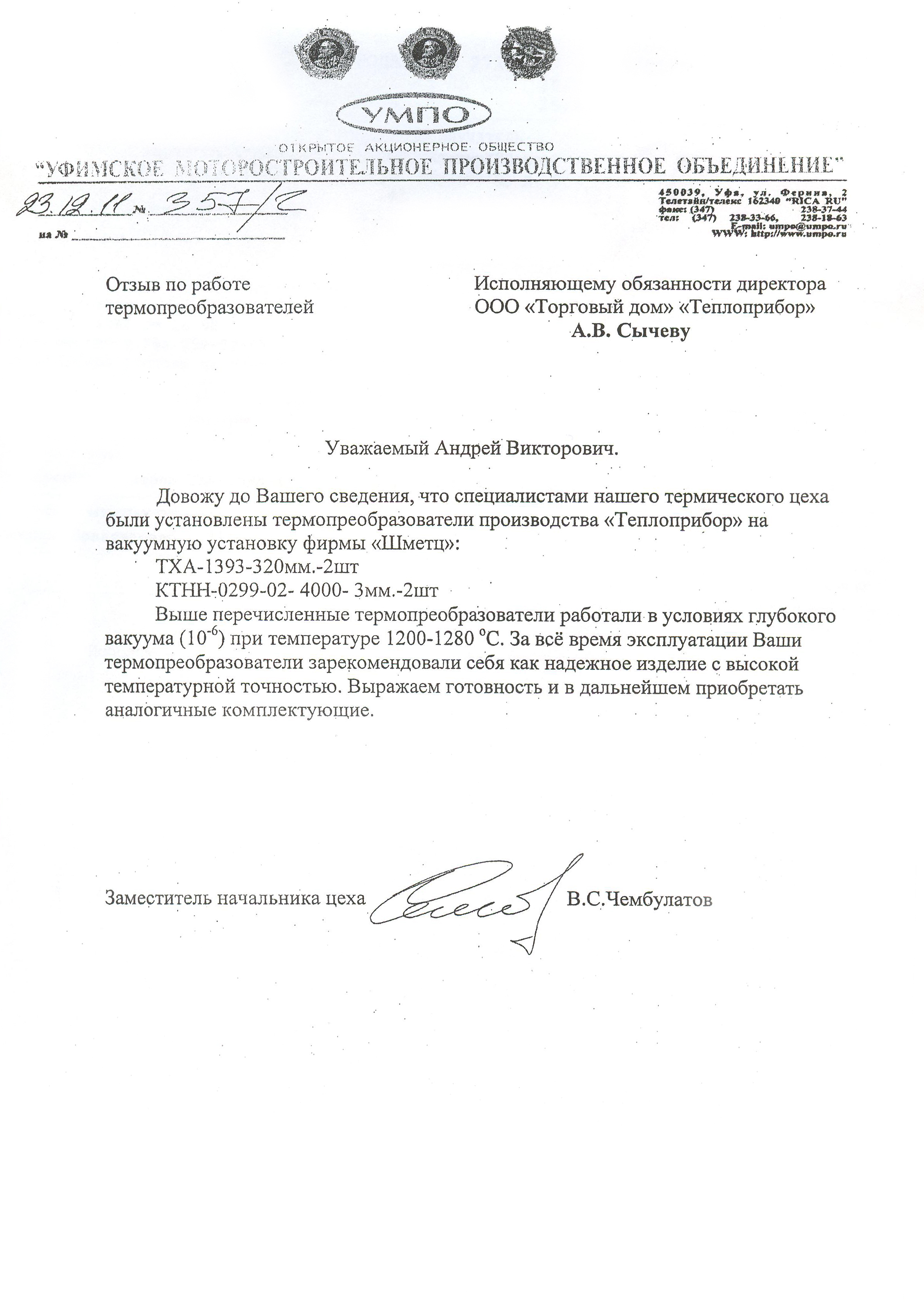 | 12 | Термопара ТХА-1393-320, Кабельная термопара КТНН-0299 | 2011 | ООО "Уфимское моторостроительное производственное объединение" |