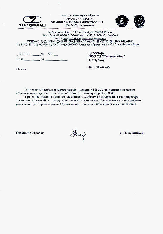 | 6 | Термопарный кабель в стойкой изоляции КТИ-ХА | 2011 | ОАО "Уралхиммаш" |